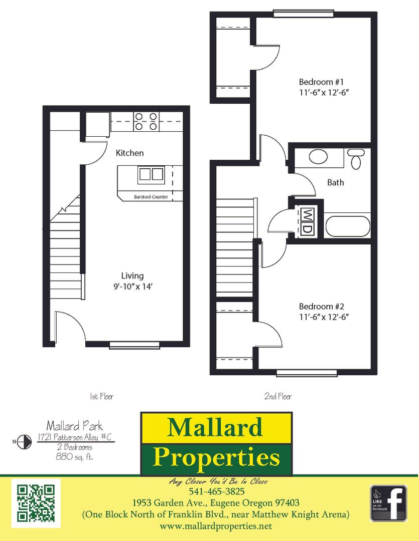 Townhouse floor plan with bedrooms and full bath on the 2nd level. Kitchen is open to the living room and has a bar-stool counter and walk-in pantry!
