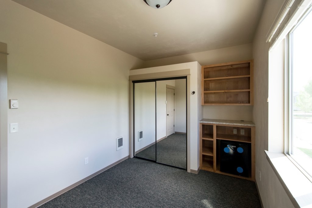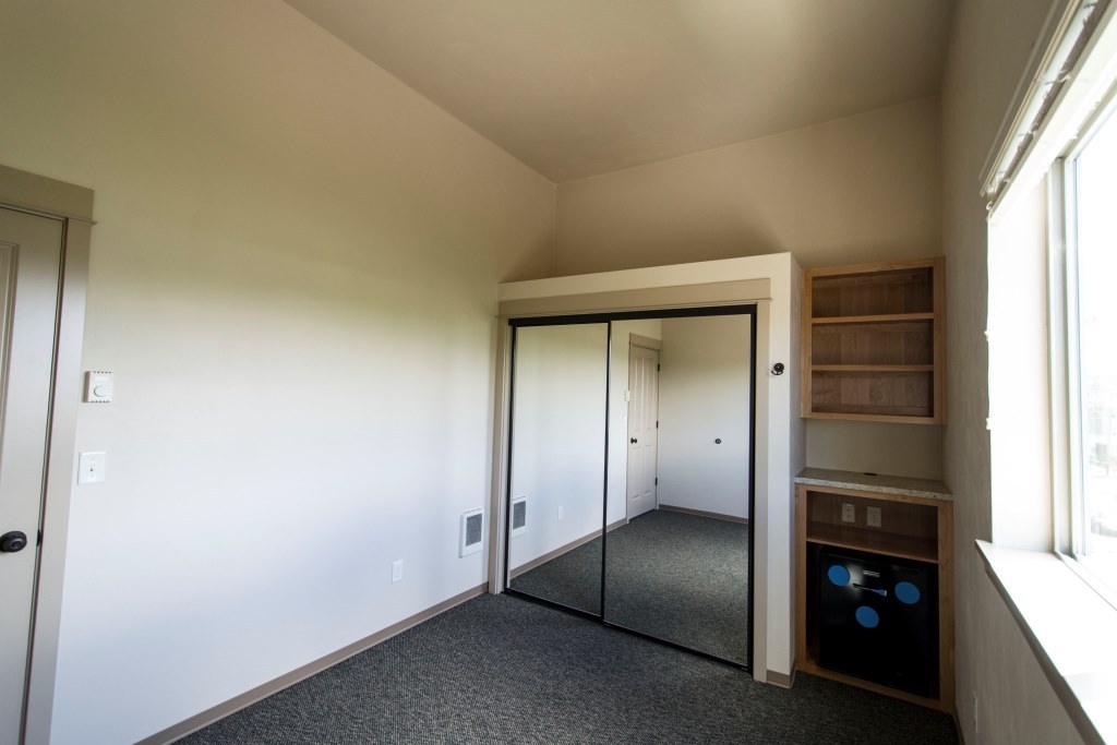 Townhouse style apartment with light and bright open concept living and kitchen area. Pocket door separates the powder room from the laundry room, which has a full-size washer and dryer, folding area, and extra storage. All three bedrooms have mirrored closed doors, over closet storage, built-in bookshelf and a mini fridge.