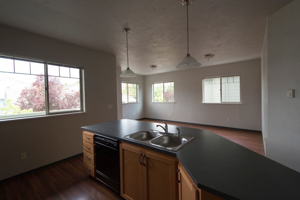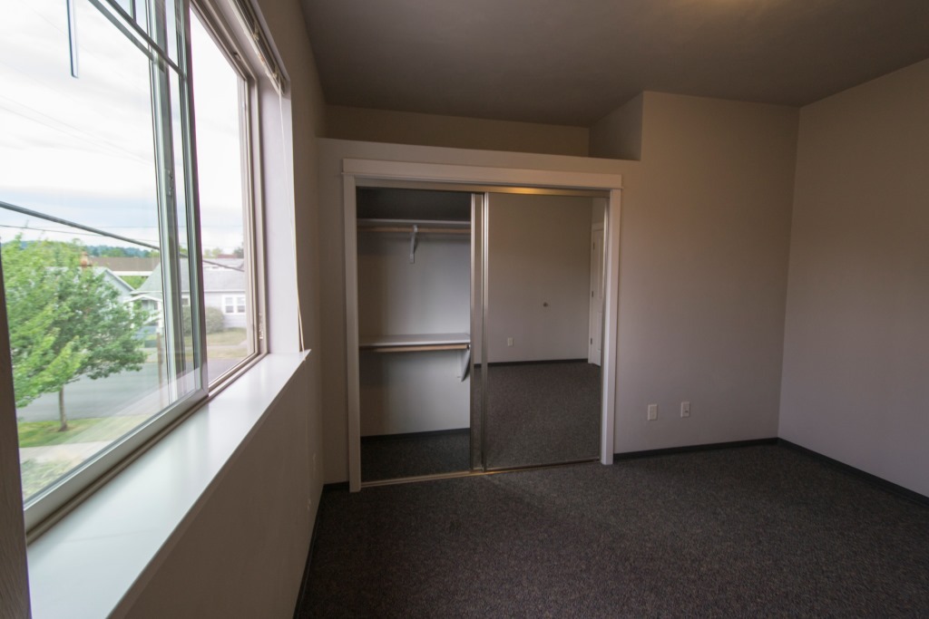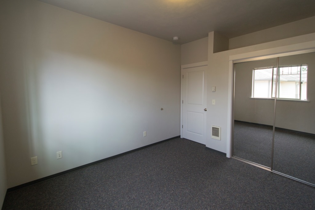 Upstairs flat features bar-stool kitchen counter for dining use. One bedroom has walk-in closet. Bathroom has pocket doors separating vanity from shower and toilet. Other bedrooms have an open space over the closet, perfect for storage. *Water for landscape sprinklers attached to water meter. This benefits other tenants or common areas.